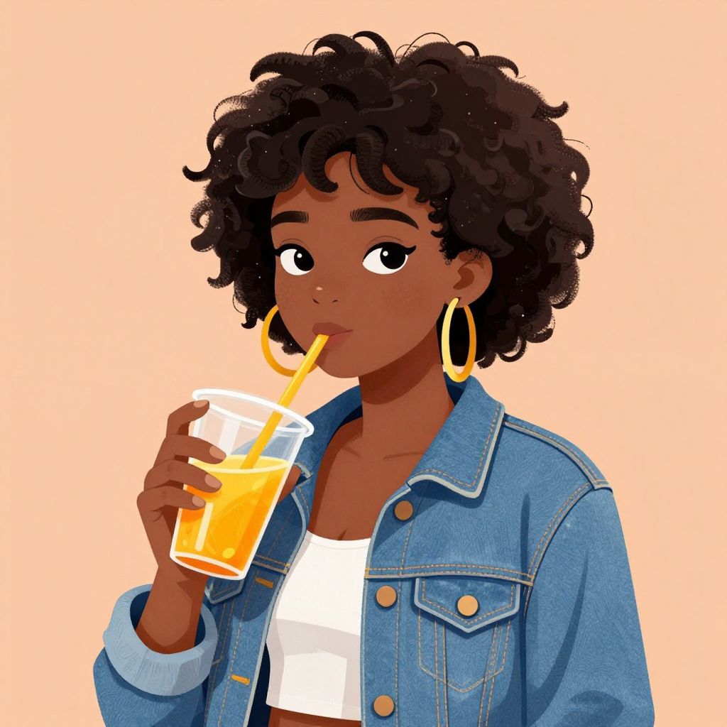 A vibrant cartoon-style illustration featuring a young Black woman with an afro hairstyle, wearing a denim jacket and large hoop earrings, sipping orange juice through a straw from a clear cup, set against a warm peach background.