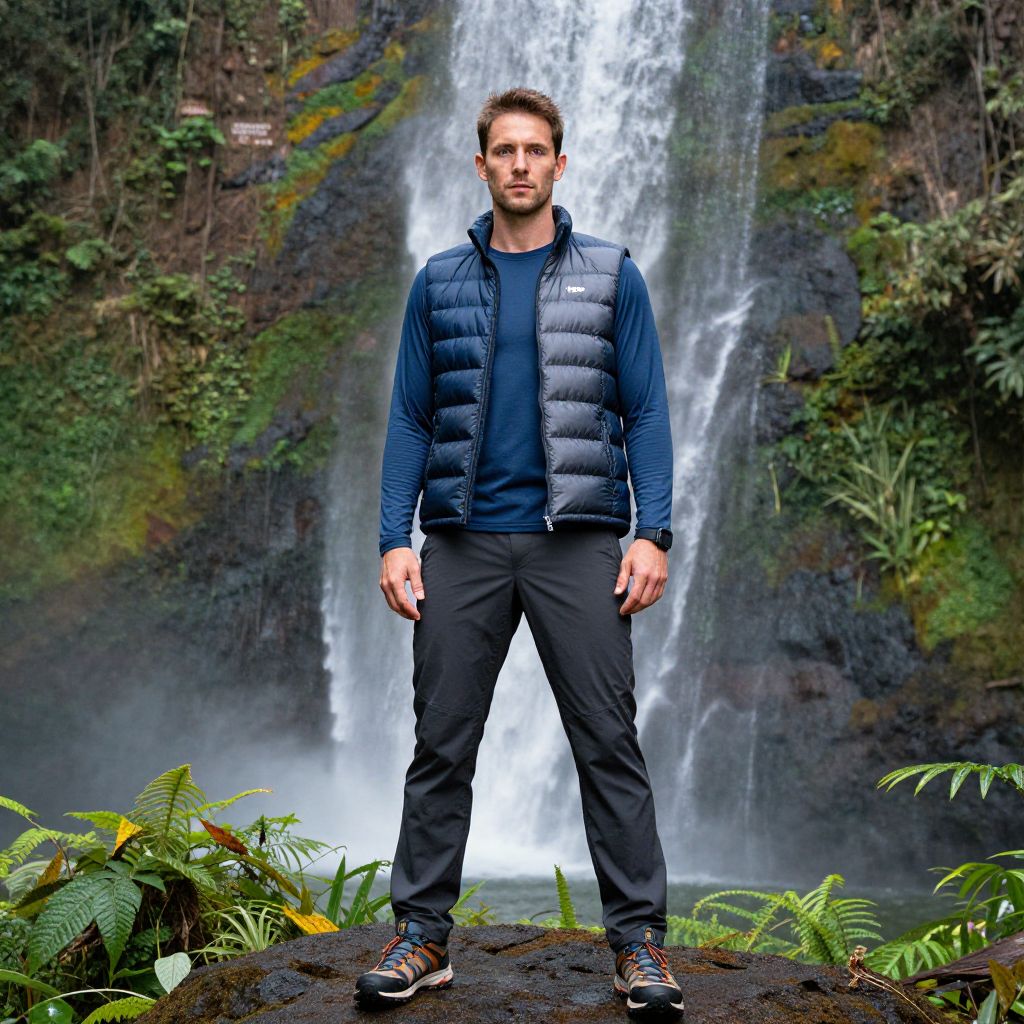 A man, performance long-sleeve base layer, stretchable hiking trousers, trail running shoes, packable down vest, navy blue and charcoal gray, tropical rainforest exhibit, vibrant foliage, cascading waterfall, oversaturated film, focused expression Man has masculine face and piercing eyes