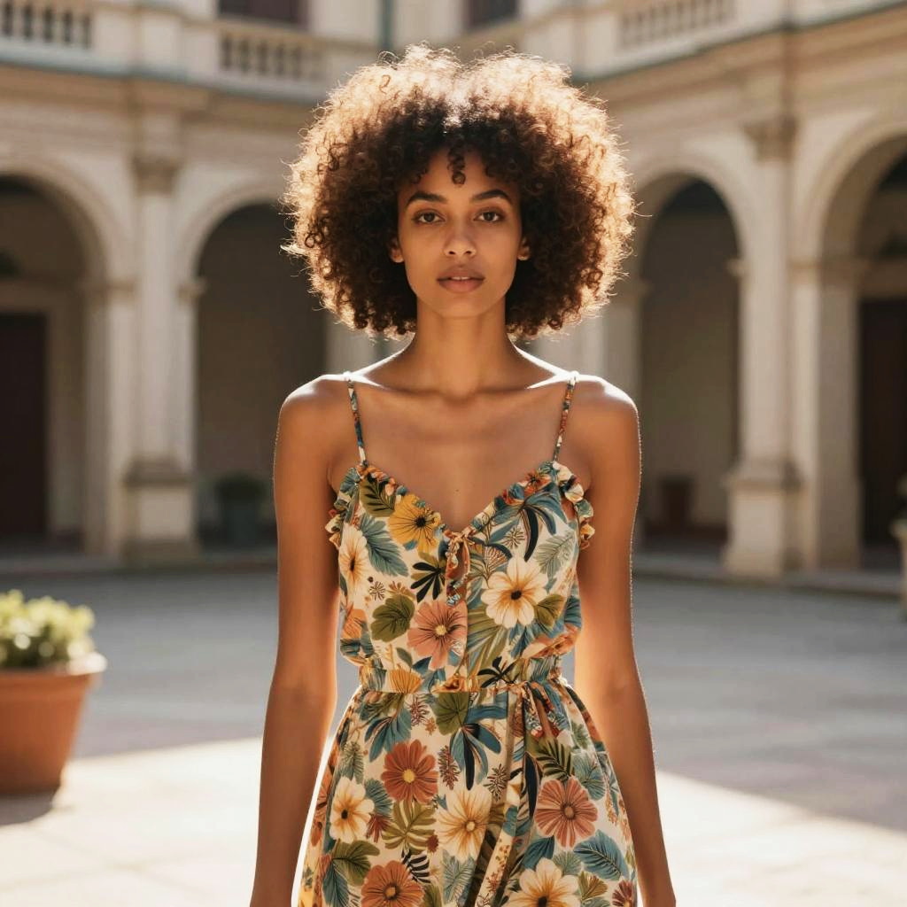 Drop Fade Afro hairstyle on woman, wearing vintage floral dress, in historic courtyard, captured in fashion editorial style with morning sunlight.