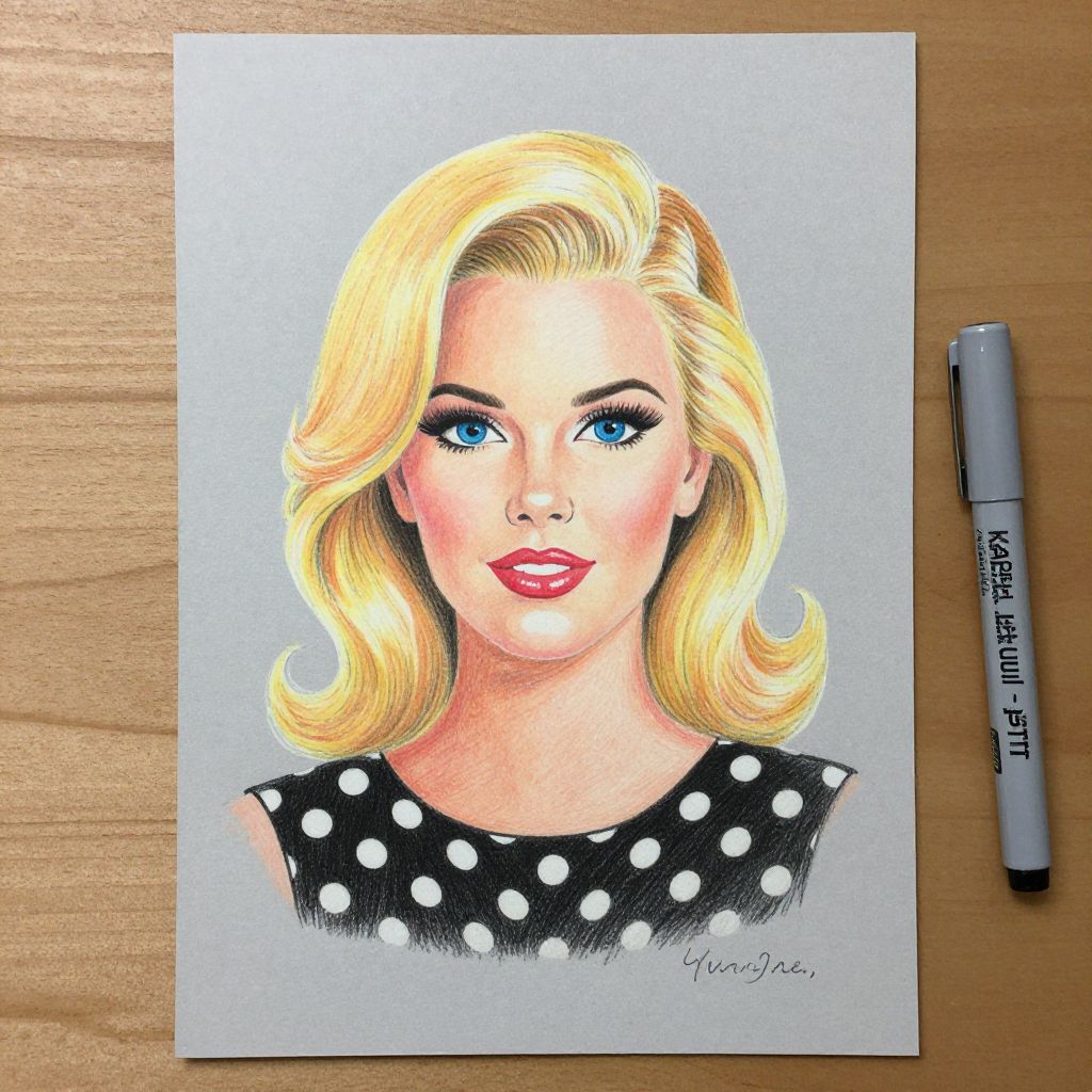 \"Yvonne,\" an 8 x 10-inch artwork by Karen Hull of 'Karen Hull Art,' features a vibrant illustration rendered in colored pencils and Pitt pens on Canson Pastel Grey Mat Board, showcasing a stylized portrait of a woman with blonde hair and blue eyes, adorned in a polka-dot top, exuding a retro and polished aesthetic.