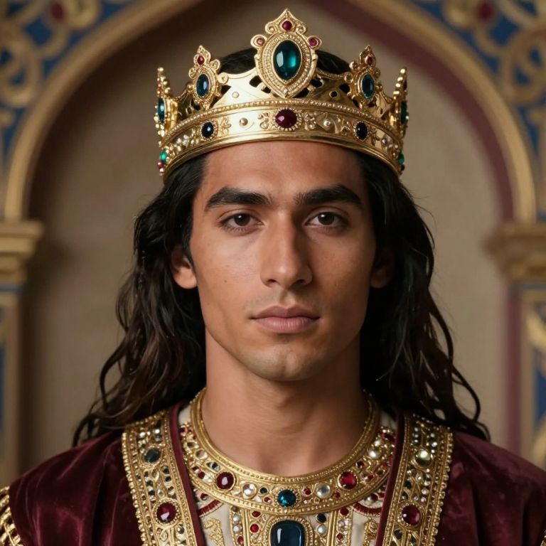 Photograph of a young man with long, dark brown hair, olive skin, and brown eyes, wearing an ornate, gold crown adorned with blue and red gems. He also wears a rich, maroon velvet robe with a matching gold and gem-studded collar. The background features an arched, decorative frame with blue and gold patterns. The man's expression is calm and dignified, suggesting a regal or royal status. The lighting highlights his face and crown, emphasizing the intricate details of his royal attire.