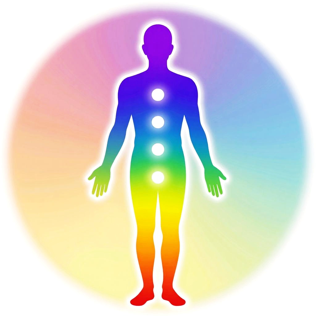 Reiki colors radiating from chakra points on a human figure, luminous gradients of red, orange, yellow, green, blue, indigo, and violet forming a harmonious energy field