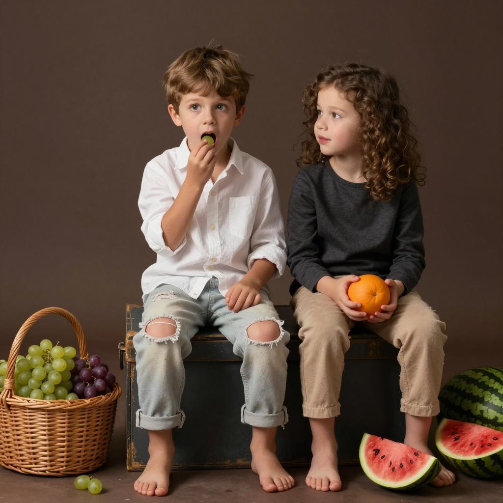 Photograph of two children, boy and girl, in a dimly lit setting. Boy with short brown hair, white shirt, and torn pants sits on a dark box, eating a grape from his head. Girl with curly brown hair, dark long-sleeve shirt, and beige pants sits beside him, holding an orange. Basket of grapes on the left, watermelon and grape slices on the floor. Dark, ured background. Boy has open mouth, girl looks at boy. Both barefoot.