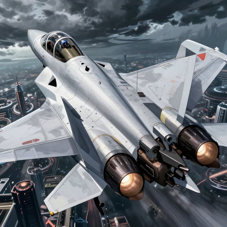 Digital illustration of a silver, dual-engine fighter jet soaring above a cityscape under a dramatic, cloudy sky. Jet's engines glow warmly.