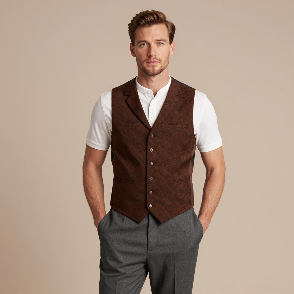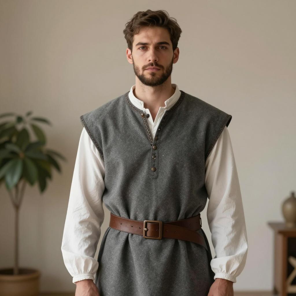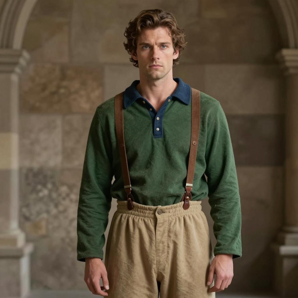 Authentic bavarian, photorealistic portrait of a handsome man with short brown hair, wearing tan overalls with brown leather straps, black vest with brass buttons, beige shirt with sleeves rolled up, standing against a blurred brown and beige background, subtle lighting, serious expression, mid-20s, caucasian, well-groomed, vintage-style, realistic ures, studio lighting