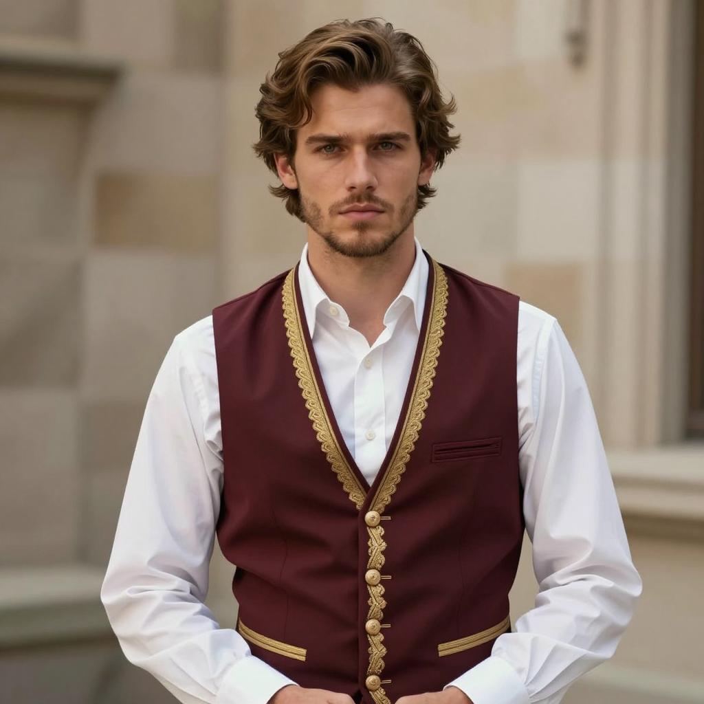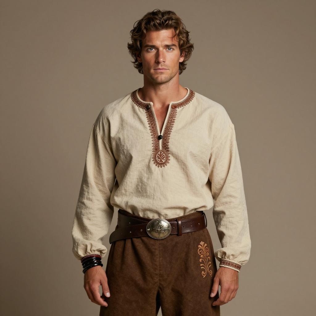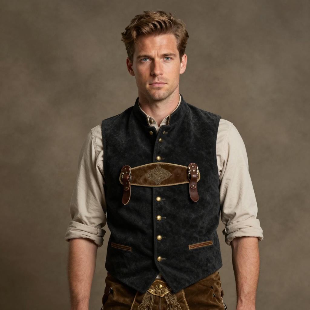 Photorealistic studio portrait of a young Caucasian man in his mid-20s wearing a traditional Bavarian outfit. The man has short brown hair, a serious expression, and is dressed in a beige shirt with rolled-up sleeves, a black vest with brass buttons, and tan lederhosen with brown leather straps and intricate embroidery. The background is a blurred gradient of brown and beige tones with subtle, soft lighting highlighting his features.