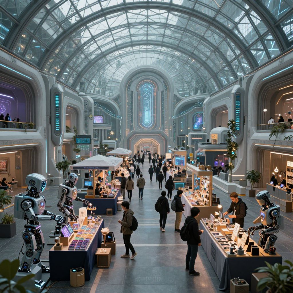 Ecrater futuristic bazaar under a sprawling glass dome, stalls filled with exotic digital goods, robotic vendors and human customers, ambient glowing lights, immersive cyber-fantasy atmosphere, intricate architectural details