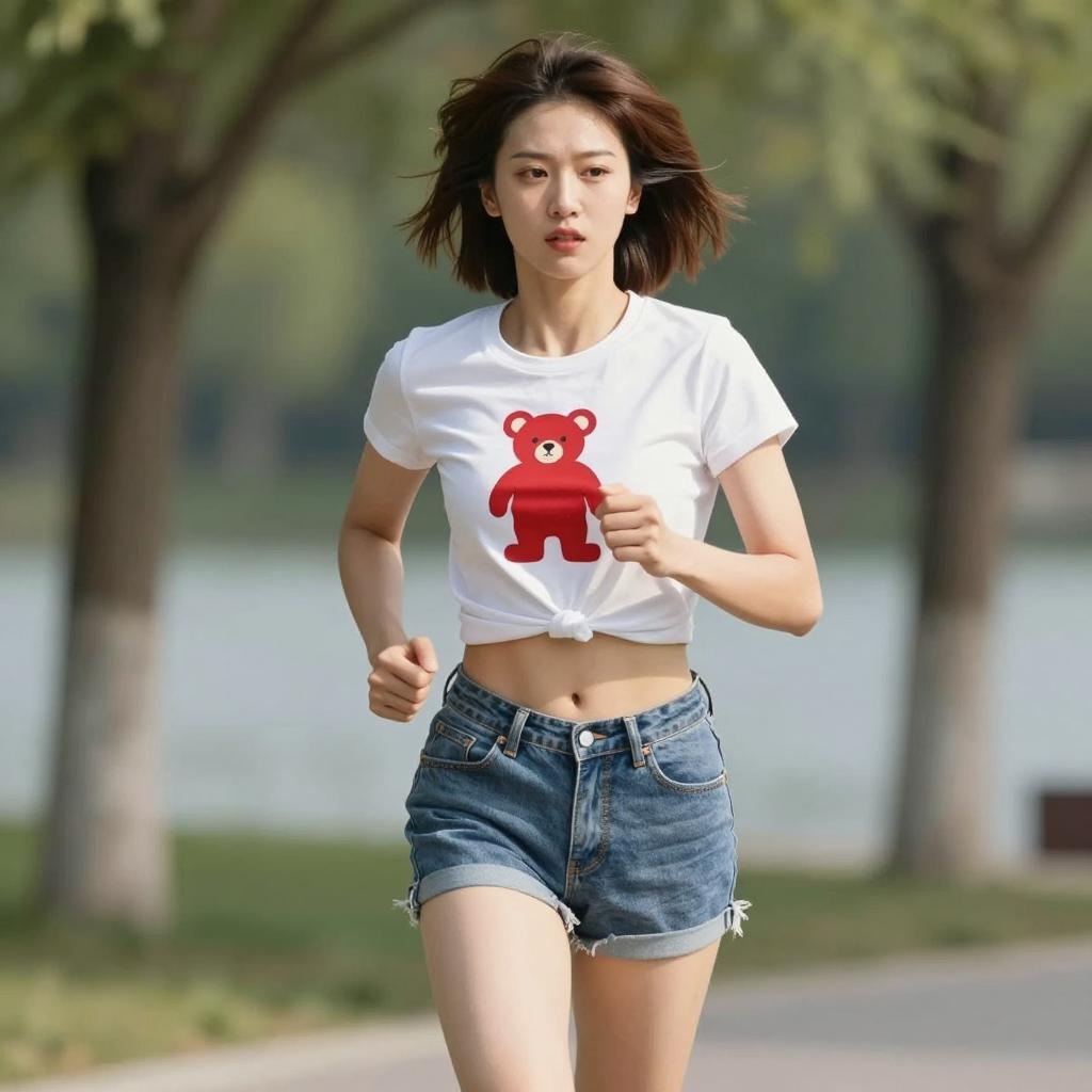 Woman with short brown hair, wearing a white cropped t-shirt with a red bear graphic and blue denim shorts, running outdoors. She has a toned physique and an intense expression. Green trees and a lake are in the background. She is in the center of the image, moving forward. Daytime.