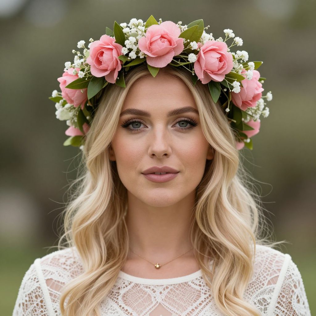 Photograph of a blonde woman with wavy hair, wearing a white lace top and a pink rose flower crown, set against a blurred green outdoor background