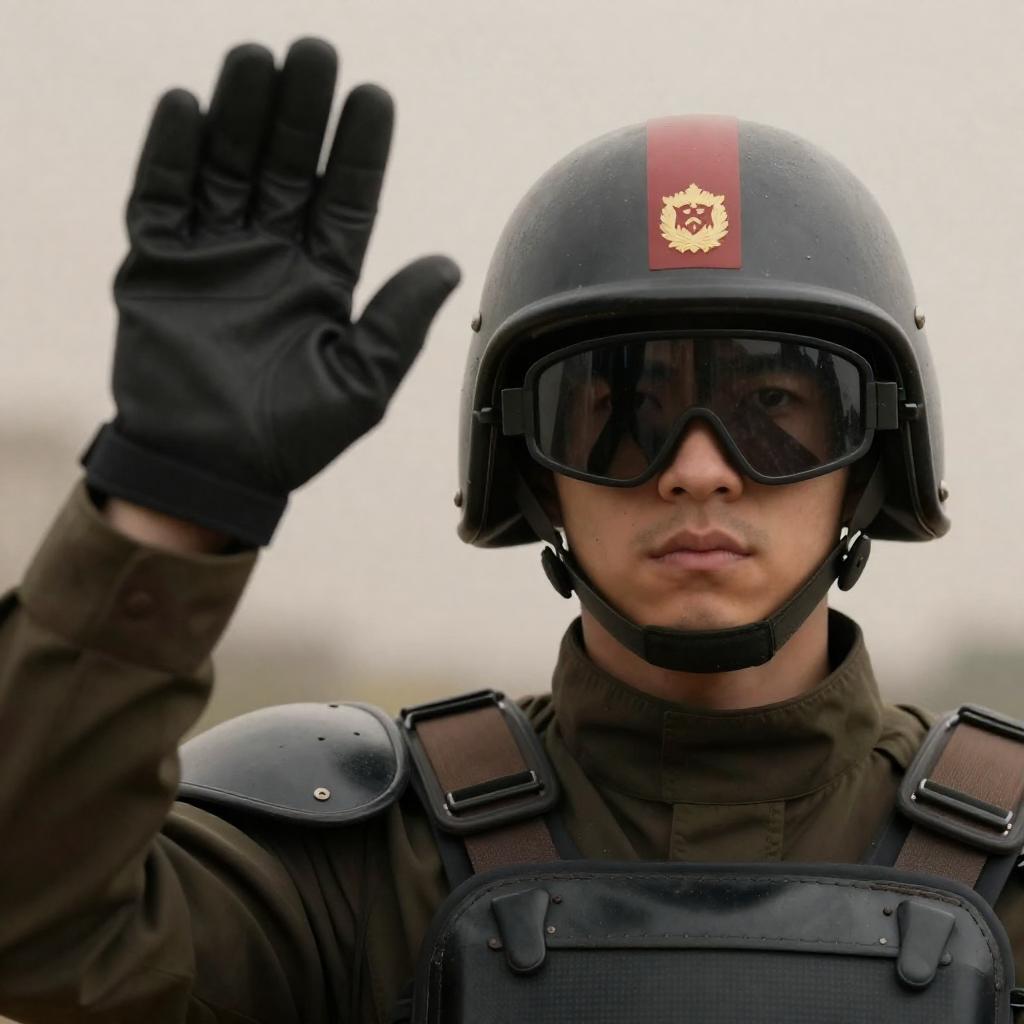 Male soldier with helmet and X-shaped visor, raising black-gloved hand. Dark brown armor, intense expression. Blurred, warm-toned background. Helmet has red stripe and gold emblem. Close-up, low-angle shot. One person.