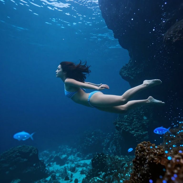Ai prompt for bikini girl swimming in a crystal-clear underwater cave, bioluminescent fish, soft blue glow, surreal underwater world, dreamy atmosphere, detailed textures, immersive scene