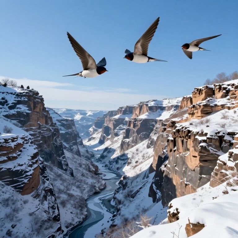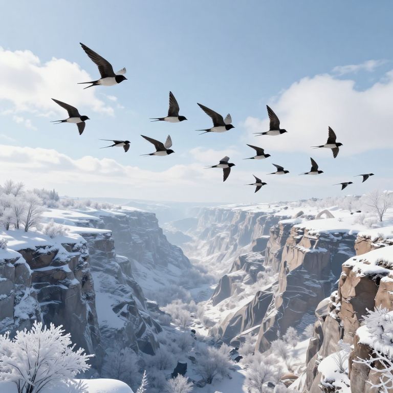 A serene 3D-rendered landscape captures a flock of synchronized swallows soaring gracefully through a frost-covered canyon, their flight harmonizing with the tranquil, high-definition winter scenery beneath a bright, cloud-dotted sky.