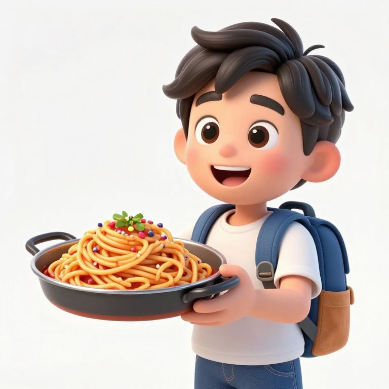 3D cartoon boy with black hair, wearing white shirt and blue jeans, backpack, holding black frying pan with spaghetti and garnish, smiling.