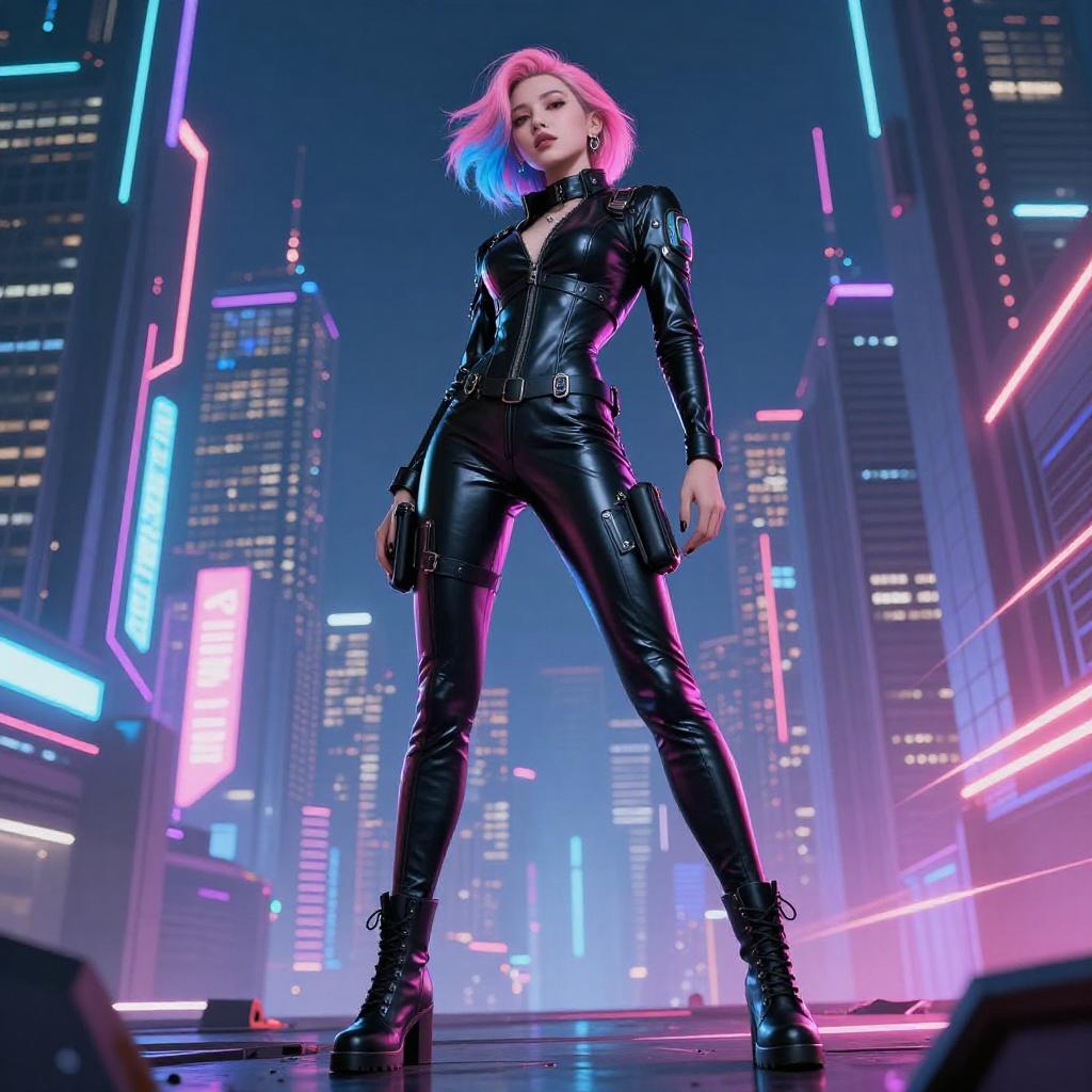 Digital art, cyberpunk, female, neon colors, futuristic city, black latex suit, pink and blue hair, high-top boots, standing, confident pose, skyscrapers, glowing lights, urban landscape, sci-fi, vibrant colors, dynamic lighting, neon accents, cyberpunk style, futuristic architecture, glowing trails, action pose, detailed textures, urban environment, futuristic fashion