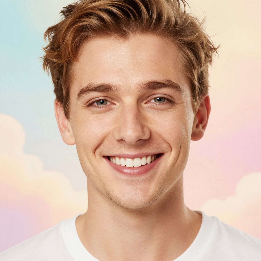 Photograph of a young Caucasian man with light skin and short, tousled brown hair. He has blue eyes, a straight nose, and a wide, genuine smile revealing white teeth. He wears a plain white shirt, and the background is a soft gradient of pastel colors including blue, pink, and yellow. The image has a bright, high-contrast, and slightly overexposed look, emphasizing his cheerful expression and youthful appearance. The overall style is clean and modern, focusing on the subject's friendly and approachable demeanor.