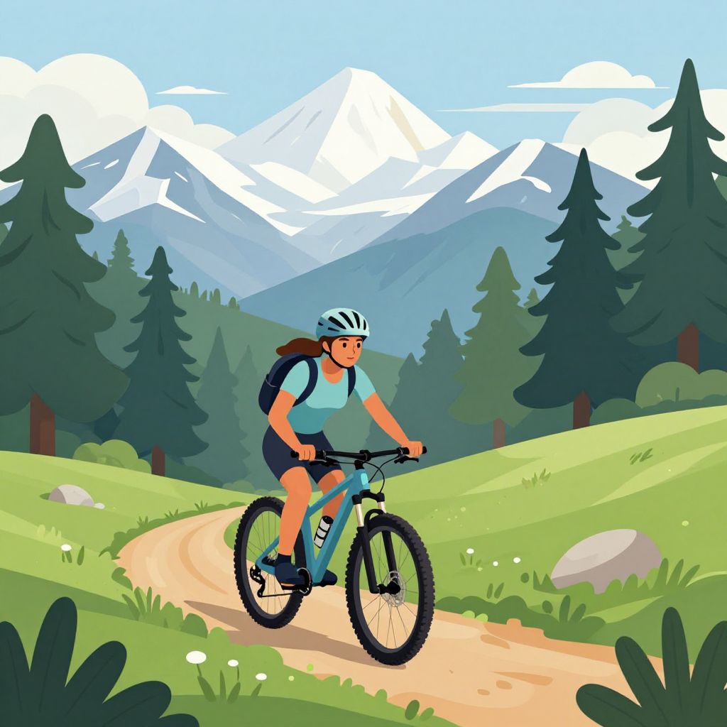 A vibrant vector illustration depicts a woman riding a mountain bike through a lush forest trail, set against a backdrop of majestic snow-capped mountains under a serene sky, showcasing a blend of outdoor adventure and natural beauty in a clean, digital art style.