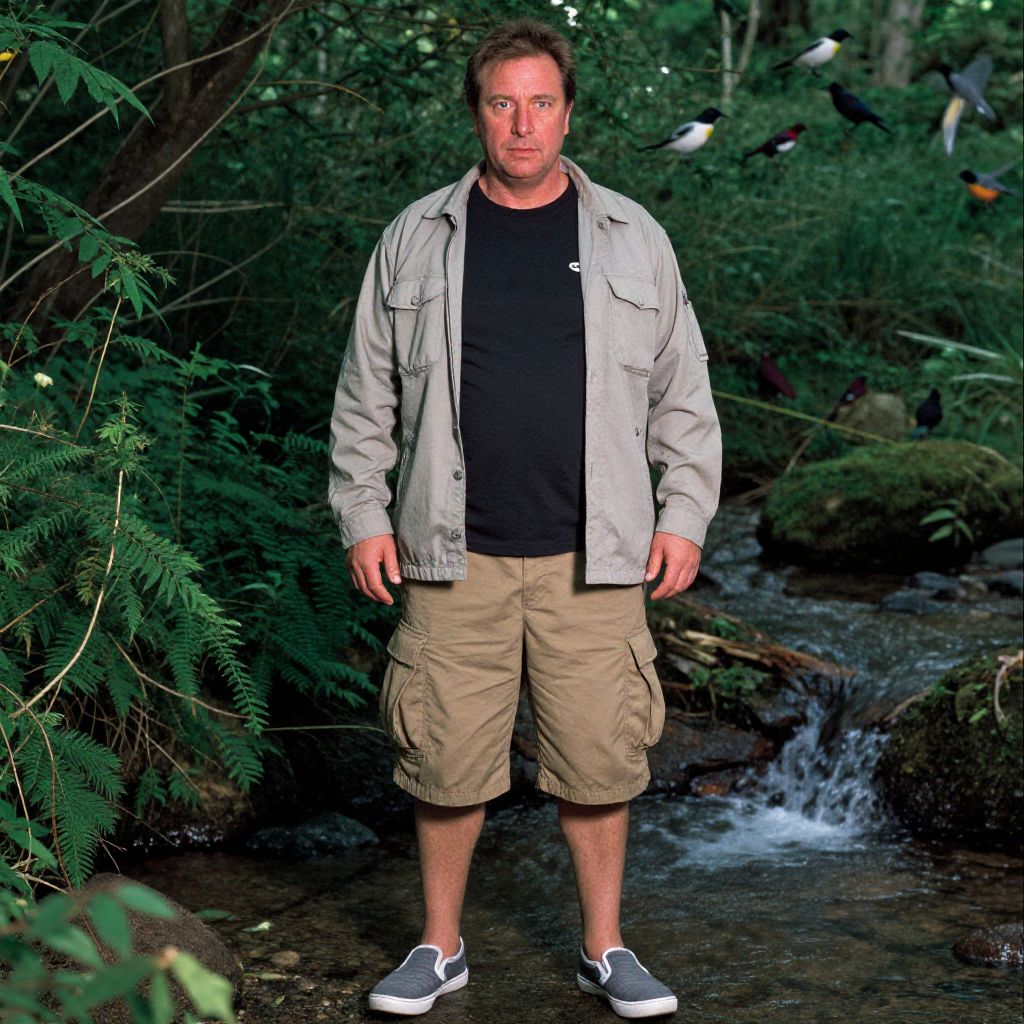 Photograph of a middle-aged man standing in a lush forest by a small stream. He has short brown hair, a slight beard, and fair skin. He wears a light gray jacket over a black shirt, beige cargo shorts, and black-and-white sneakers. His expression is neutral. The background features dense green foliage, ferns, and trees, with a gentle waterfall visible to the right. Birds are perched on branches in the upper right corner. The lighting is natural, highlighting the man and the forest's greenery. The man stands with his arms slightly away from his body, feet shoulder-width apart.