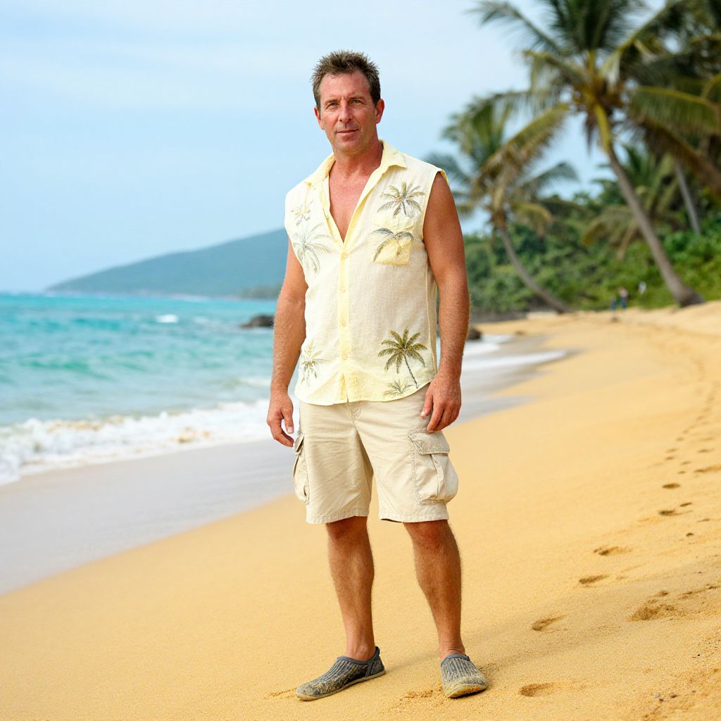 Photograph of a middle-aged man with short brown hair, wearing a light jacket, black shirt, beige cargo shorts, and black-and-white sneakers,