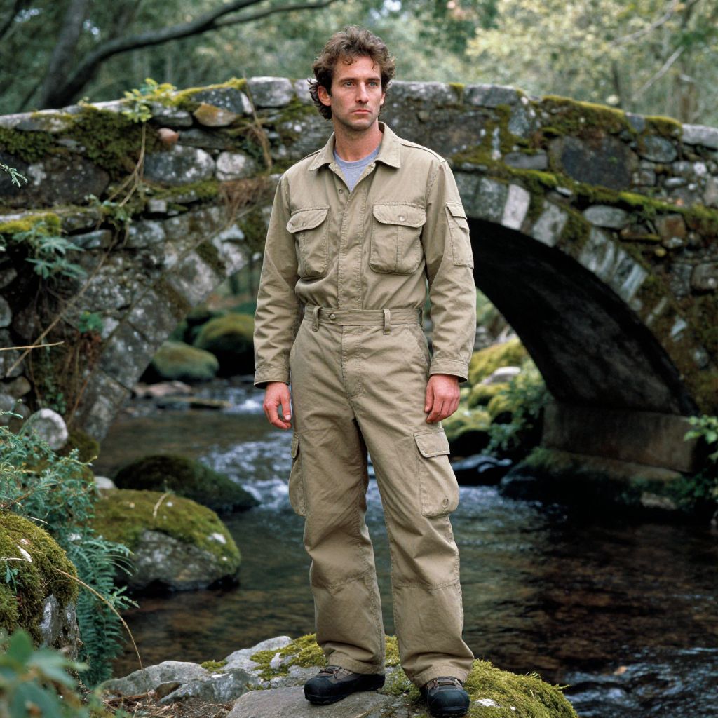 A man, heavy-duty cargo shorts, breathable khaki fabric, quick-dry black t-shirt, lightweight utility jacket, slip-resistant sneakers, lush green undergrowth, trickling stream, chorus of chirping birds, Cibachrome style, focused expression. Man has masculine face and piercing eyes