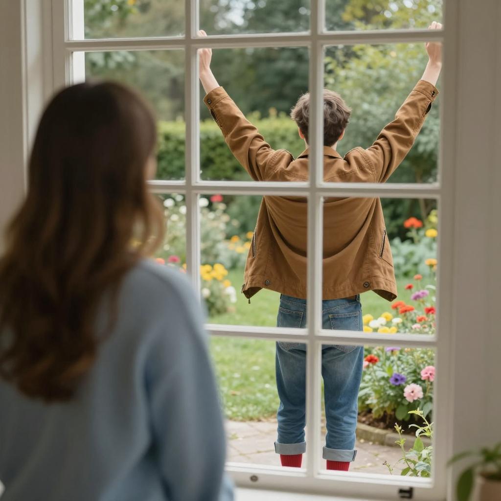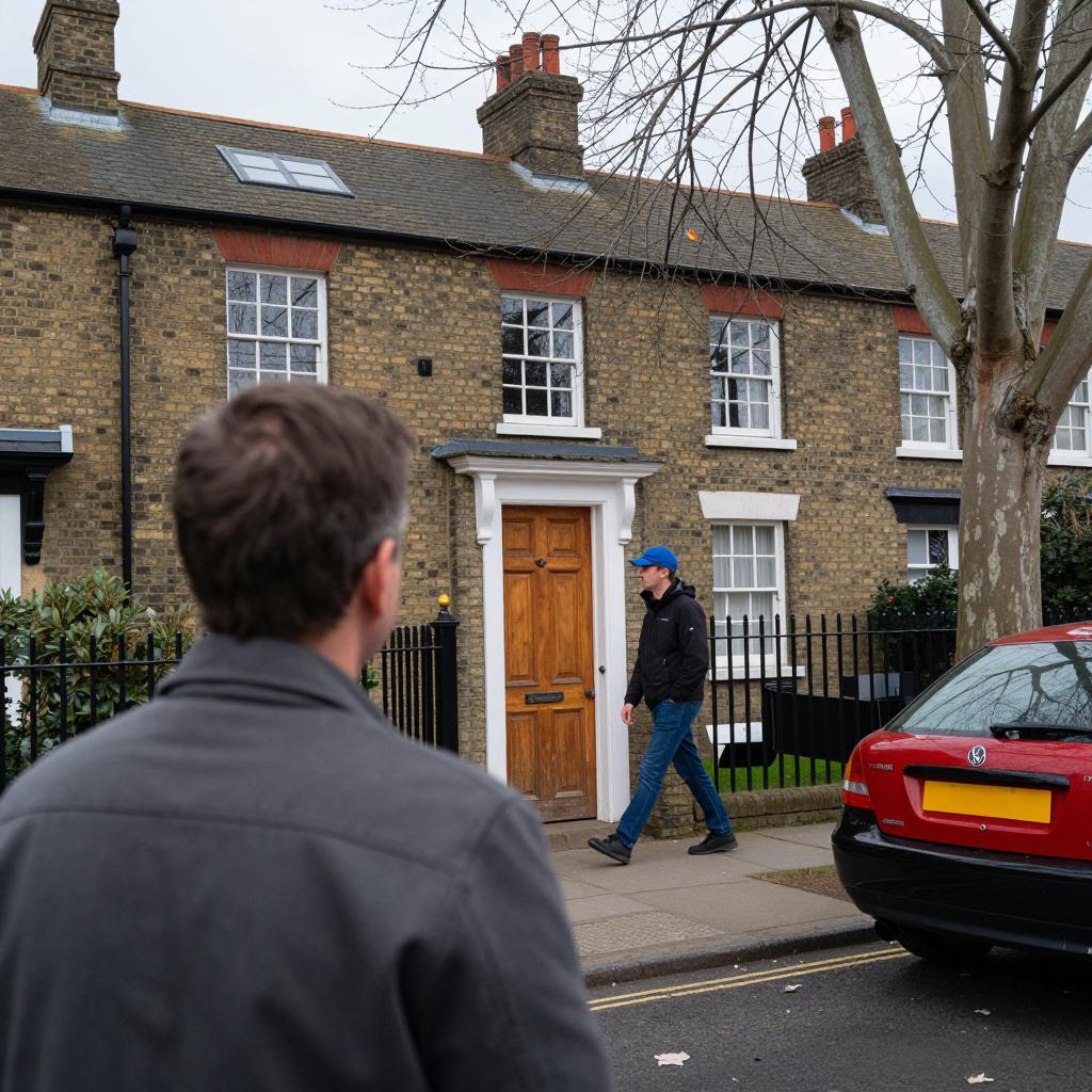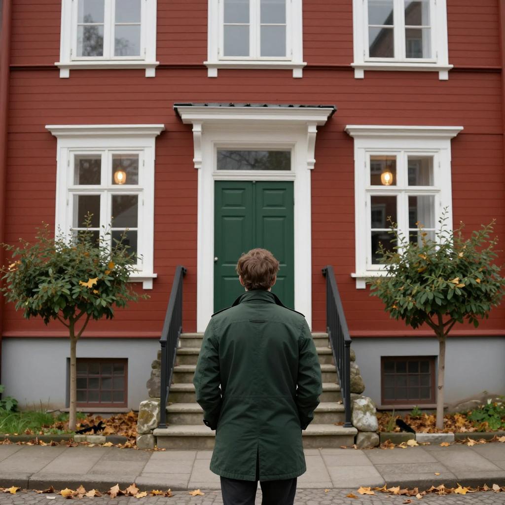 Red wooden house with lit windows, centered green door, stone steps leading up, two small trees on either side. Man with brown hair, wearing dark green coat, stands in foreground, facing house, back to viewer. Fallen leaves on ground.
