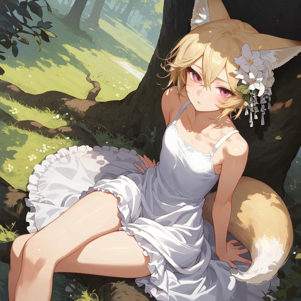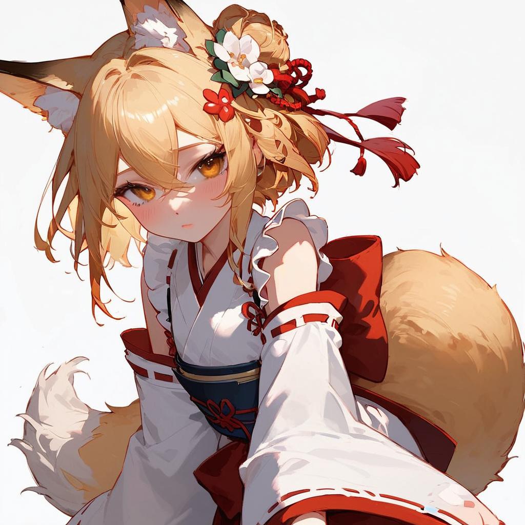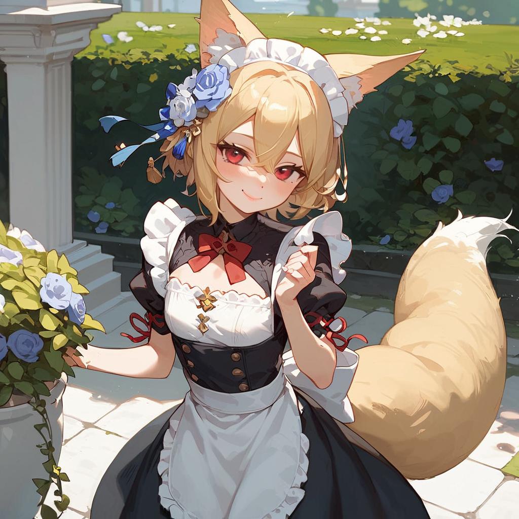 Score_9, source_anime, by akai sashimi, best quality, masterpiece, uncensored1girl, maid, garden, outdoors, smile, sen, blonde hair, 1girl, animal ears, fox ears, blush, animal ear fluff, solo, hair ornament, fox girl, hair flower, hair between eyes, short hair, fox tail, tail, flat chest, yellow eyes