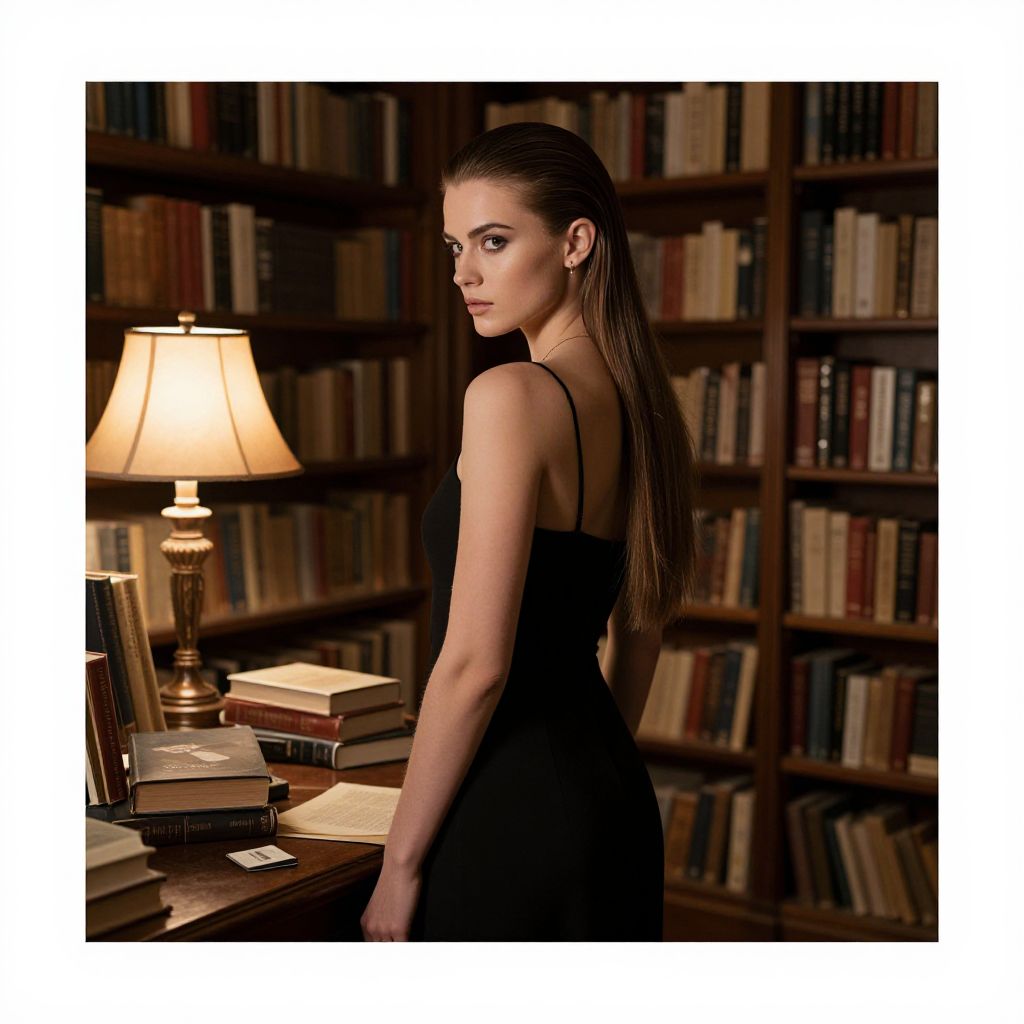 Woman with slicked-back long hair inside a vintage bookstore, soft lamp light, scattered books, warm atmosphere, subtle shadows, elegant pose, highly detailed, studio photography style.