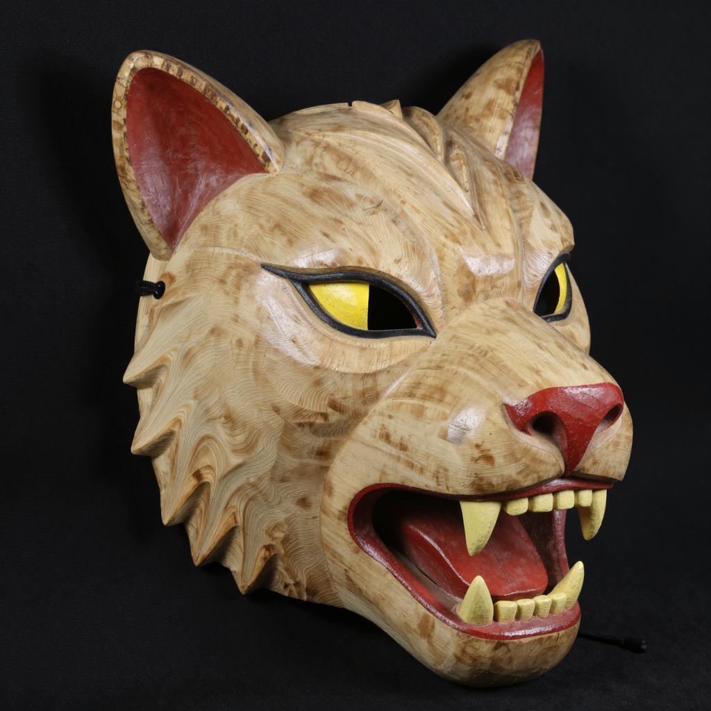Wooden mask of a snarling animal with beige fur, black slit eye, yellow iris, sharp yellow teeth, red tongue, and red nose. Black background. Mask has two pointed ears and a visible black string. Realistic carving style.