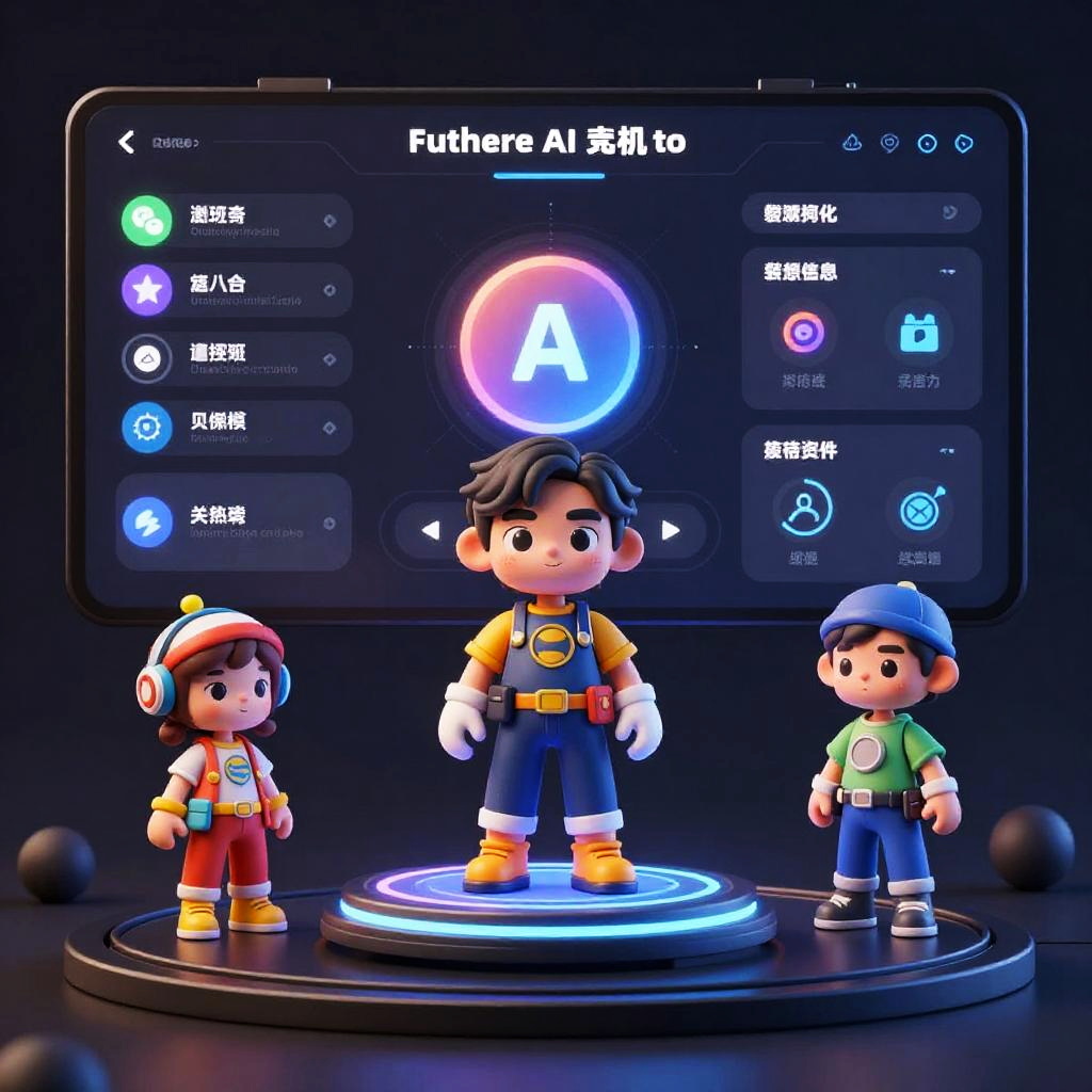 Futuristic superhero AI generator dashboard, colorful 3D avatars rotating on digital platforms, touch interface with icons for powers, costumes, and abilities, sleek and minimalistic design combined with neon accents, dark mode UI with glowing edges, high-resolution detail