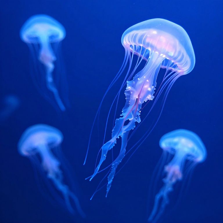 Whimsical jellyfish, rendered in a high-definition digital art style, float gracefully against a deep blue backdrop, their bioluminescent bodies glowing with ethereal light and creating a mesmerizing visual effect that evokes the serene beauty of the ocean depths.