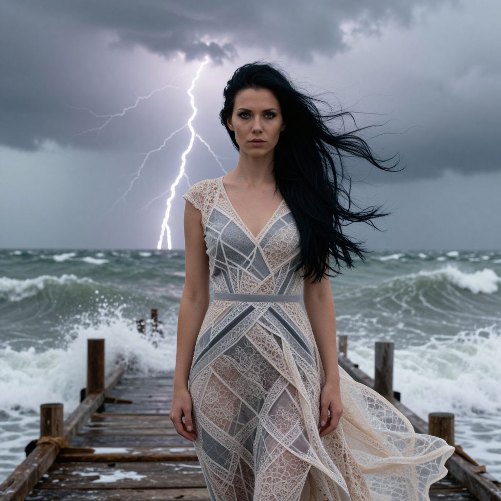 A cryptic woman with piercing blue eyes and flowing raven hair stands resolute on a rustic pier overlooking a stormy sea in this photorealistic portrait. Her dress, an elegant fusion of delicate lace and geometric lines, contrasts against the bold gray and white sky with its crackling lightning. The wind billows her attire as she conveys both vulnerability and strength, her gaze fixed beyond the tumultuous waters. This image embodies human resilience, where her determination clashes with nature's tempestuous backdrop, creating a striking visual metaphor for weathering life's storms.