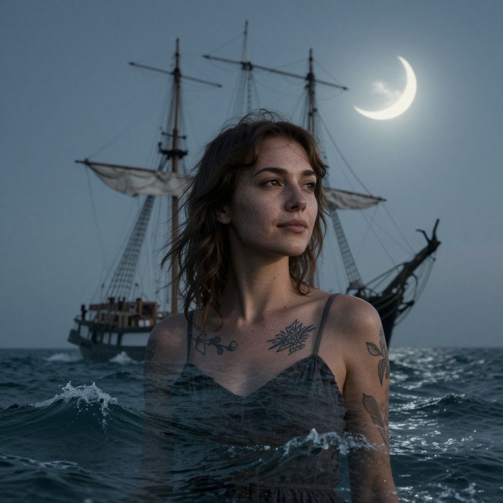 A haunting portrait of a stoic young woman, her enigmatic smile lost amidst turbulent seas, captures the wisdom etched on her weathered features from countless voyages. The ship she once commanded blends seamlessly with the ebbing waves, its masts transformed into gnarled branches reaching skyward like skeletal fingers. A crescent moon casts an ethereal glow upon this scene of solitude and mystery, illuminating ancient mariner tattoos that adorn her skin. This double exposure masterfully intertwines human life's reality with the eternal enigma of the sea.