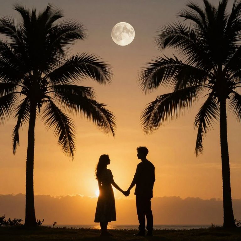 In the golden embrace of twilight, two silhouettes hold hands amidst palm-fringed serenity, their journey illuminated by the eternal dance of sun and moon, evoking a timeless tale of love and longing.