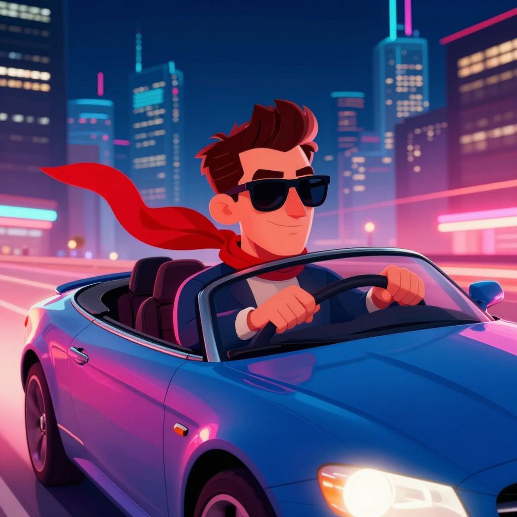 Sentient traffic cone, donned in a tiny top hat, hovers atop its orange-and-white striped body as three miniature square cars soar skyward, guided by its outstretched arms toward a vibrant sky filled with cascading orange confetti and a striking bolt of lightning.