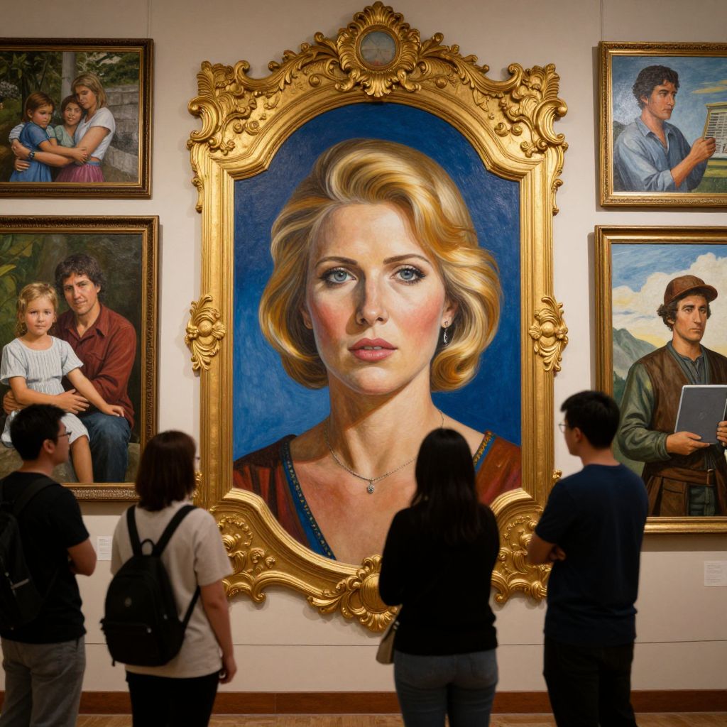 Photograph of an art gallery featuring a large, ornate, gold-framed portrait of a blonde woman with blue eyes and wavy hair, set against a blue background. She wears a red top with a blue necklace. Four other paintings are on the white wall, including a family portrait, a couple, and two men in casual attire. Five people, three women and two men, stand in front of the paintings, facing the wall. The gallery has warm, ambient lighting, and the floor is wooden. The image captures the art and the viewers' reflections in a realistic style.