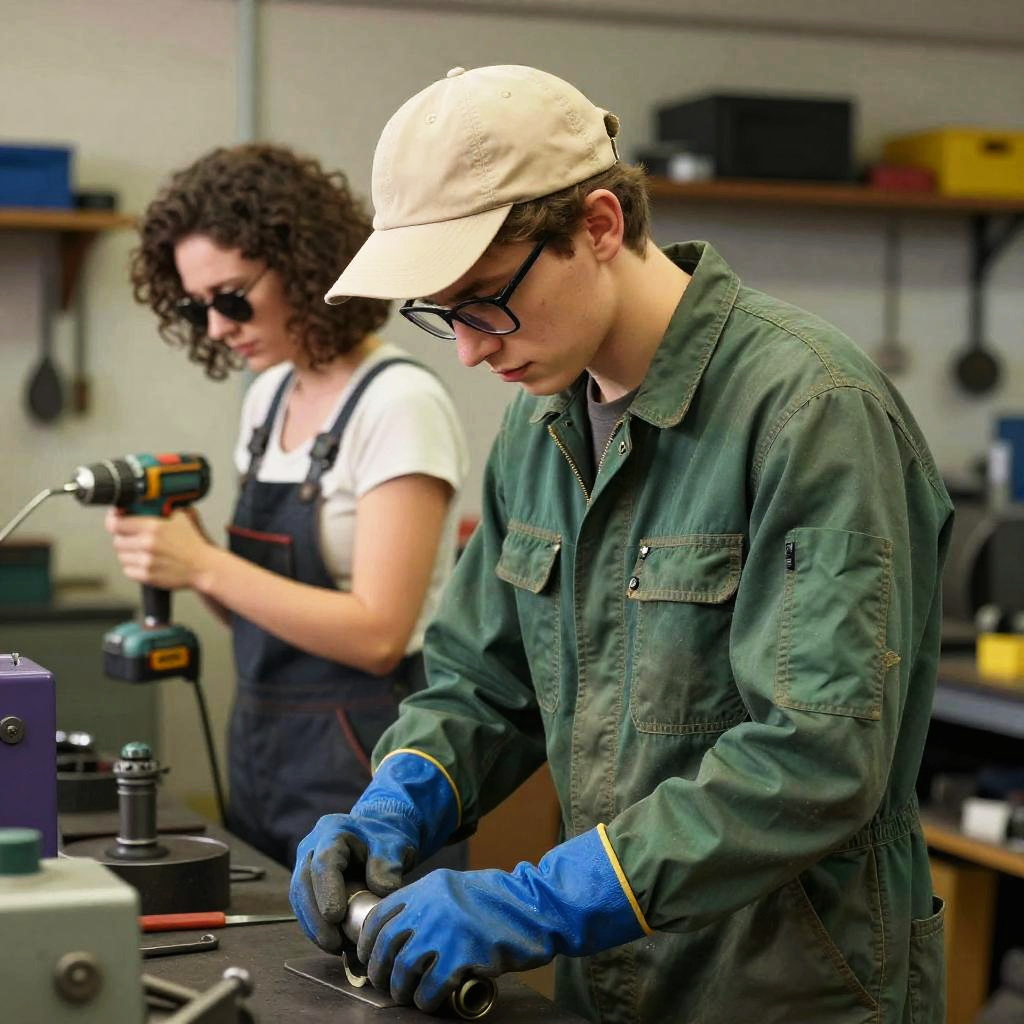 Photograph of two mechanics in a workshop. The foreground shows a young man with glasses and a beige cap, wearing a green jumpsuit and blue gloves, working on a cylindrical object. In the background, a woman with curly brown hair and sunglasses is operating a drill. The workshop is cluttered with tools and machinery, and there's a purple object on the left. The image has a slightly exaggerated, colorful style.