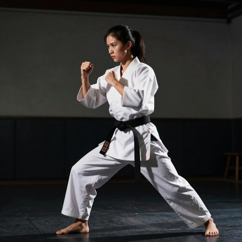 Photograph of a young woman with medium skin tone and black hair in a ponytail, performing a karate stance. She wears a white karate gi with a black belt tied at the waist, and is barefoot on a dark, matte-finish floor. Her right arm is bent with a clenched fist near her chest, while her left arm is extended downward. The background is dimly lit, with a dark wall and some indistinct shadows, emphasizing her focused expression and athletic stance. The image highlights her discipline and strength.