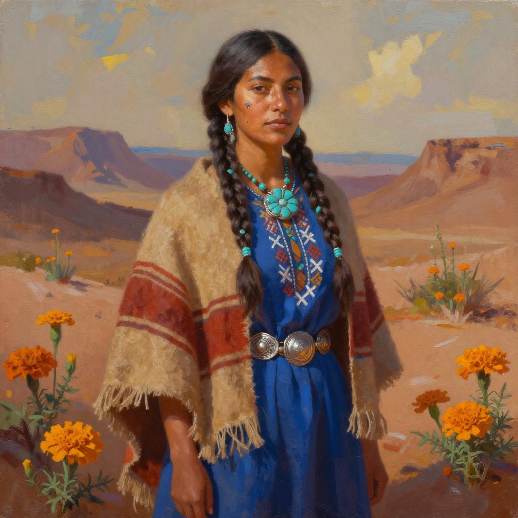 An artistic portrayal of a young Navajo woman in her mid-20s with long dark braided hair threaded with turquoise beads, warm copper-toned skin, calm confident gaze and a small geometric ear tattoo dressed in a ceremonial indigo ribbon skirt dress with intricate cross-stitch embroidery, a handwoven wool shawl in ochre and crimson stripes, a polished turquoise squash-blossom necklace and silver concho belt, standing on a sunlit desert mesa surrounded by blooming desert marigolds, rendered in a vibrant digital oil painting with bold brushstrokes, warm earthy palette, dramatic lighting, and textured canvas effect.