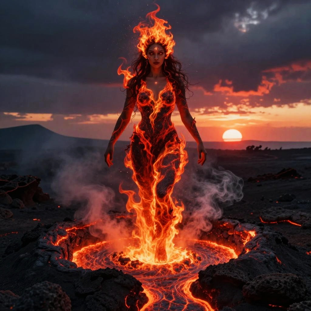 Pele – Goddess of volcanoes and fire, portrayed as a majestic spectral figure wreathed in crimson flames, hovering above a pool of bubbling magma with eyes gleaming like stars, standing in a volcanic fissure emitting sulfurous smoke on a desolate island lit by fiery sunset hues and scattered volcanic rocks.