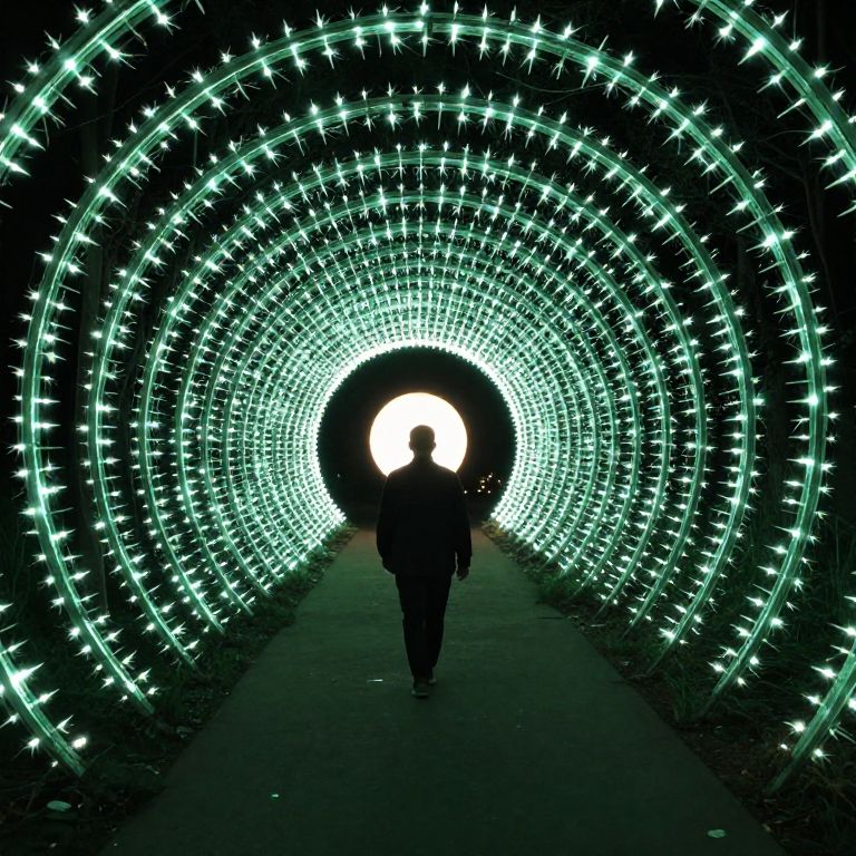 Photograph of a person walking through a tunnel illuminated with concentric circles of glowing, teal-green lights. The tunnel's walls are entirely covered in these lights, creating a mesmerizing, almost hypnotic effect. The person's silhouette is dark, contrasting sharply with the bright tunnel. The path is narrow, and the lights form a spiral pattern that draws the eye towards a bright, white light at the tunnel's end. The ground is dark, adding to the tunnel's dramatic lighting. The overall effect is futuristic and surreal.