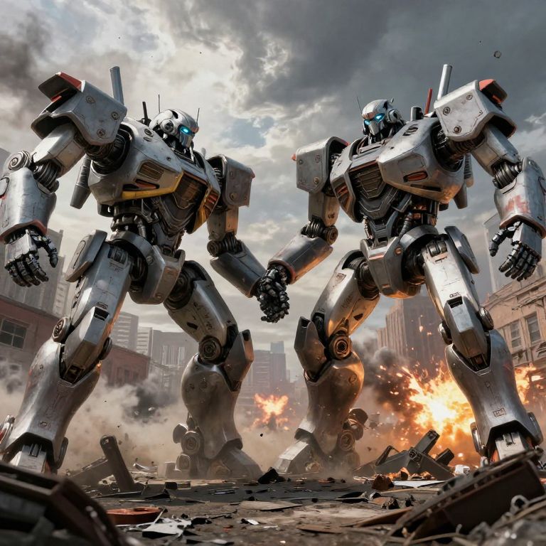 Battle of Yonkers art capturing a pivotal moment of giant robotic machines battling fiercely in the heart of Yonkers city, with detailed mechanical designs, urban decay, smoke explosions, and a sense of monumental conflict under a dramatic sky.