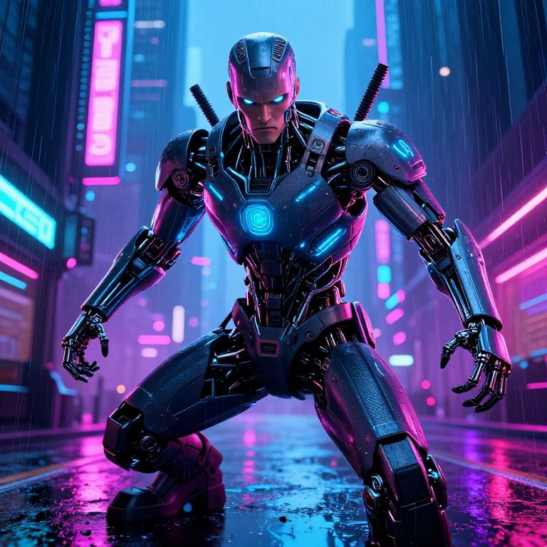 A sneer from a futuristic cyborg in a neon-lit cyberpunk city, glowing mechanical parts and aggressive stance, vibrant colors with rain-soaked streets, concept art style