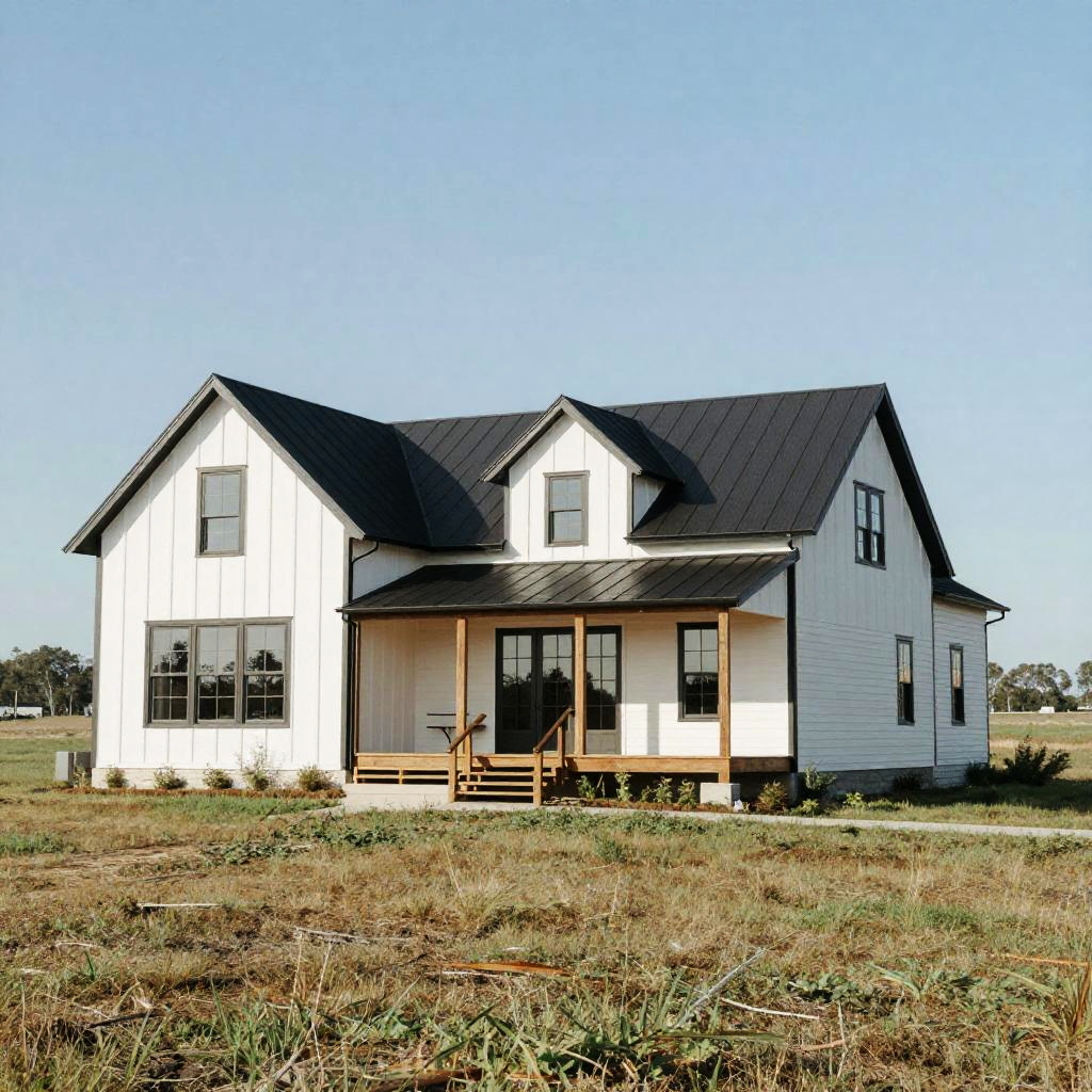 Black and white ranch house exterior, wide single-story layout, clean lines, large windows, rustic wooden porch, surrounded by open grassland, bright natural light, crisp shadows