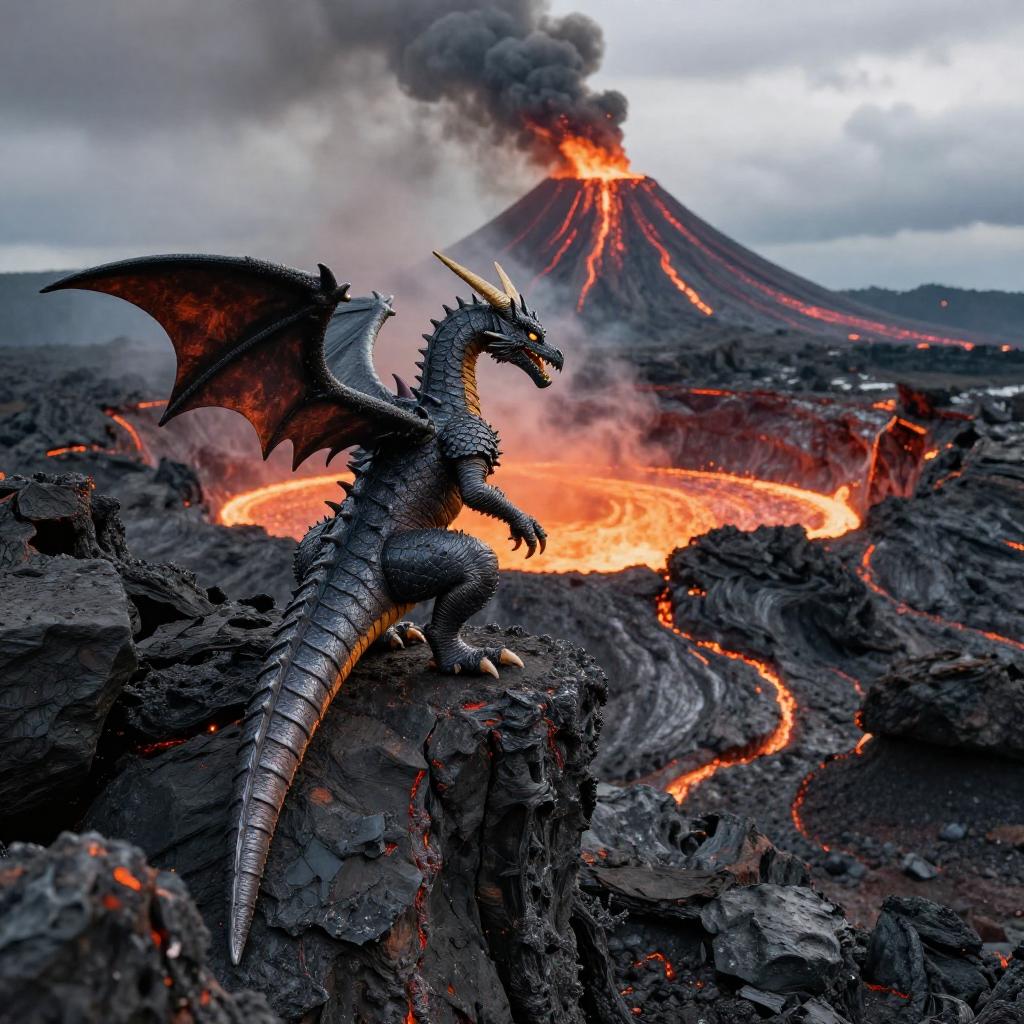 Volcanic drake rider perched in obsidian lava cliff overlooking a molten caldera. Shot on Sony Alpha a7R IV, (hyperdetailed), 8K HDR, dramatic lighting, cinematic atmosphere.