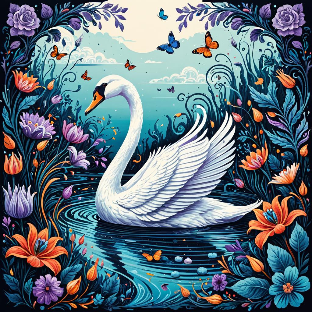 Tiger portrayed with fantastical surreal aesthetics, featuring organic, flowing forms and vibrant, saturated colors. The composition blends realistic and stylized motifs, incorporating elements like flowers, leaves, and butterflies. Clean, precise line work adds structure, while dreamlike movement and fluidity create a rich, immersive scene. The color palette includes rich colors - fiery amber, glacier blue, and verdant green