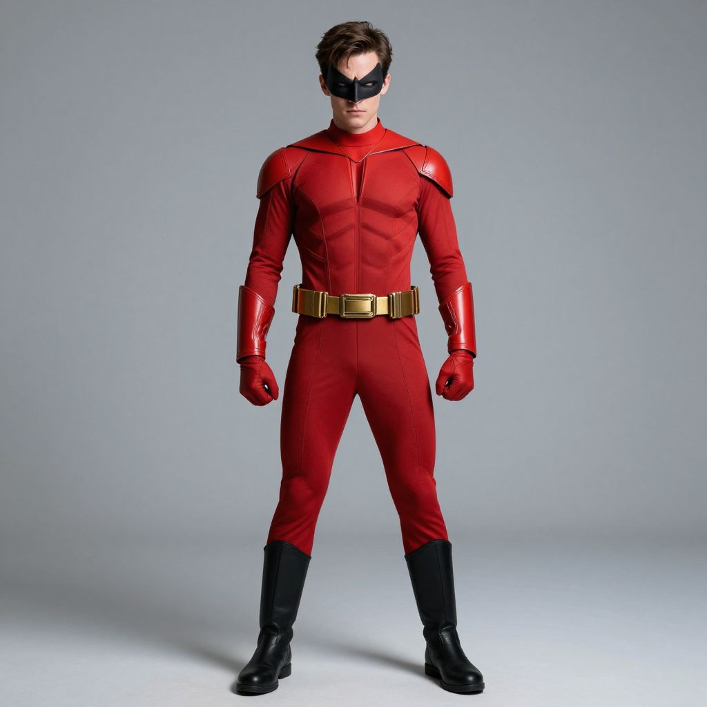 Red nightwing costume, 1boy, male focus, solo, realistic, gloves, boots, superhero, standing, belt