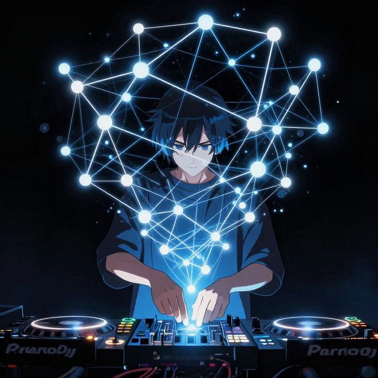 Digital anime-style illustration of a male DJ manipulating a music mixer with glowing, interconnected mathematical patterns floating above his hands. The color scheme features vibrant blue, black, and white tones, emphasizing a futuristic and tech-inspired atmosphere. The DJ has dark blue hair and wears a loose dark blue shirt, depicted in a style reminiscent of Inio Asano's artwork.