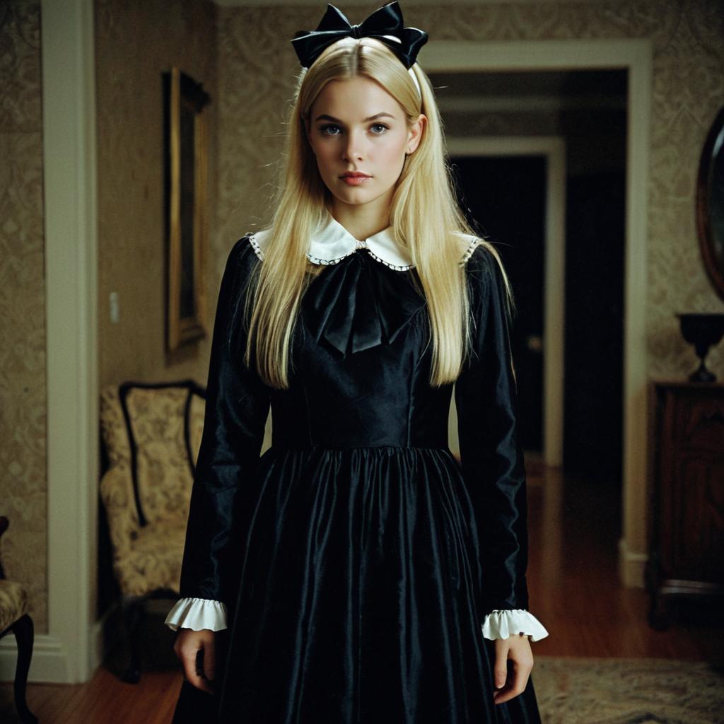 Alice costume,1girl, solo, dress, long hair, blonde hair, realistic, puffy sleeves, blue dress, short sleeves, lips, puffy short sleeves, blue eyes, looking at viewer, standing