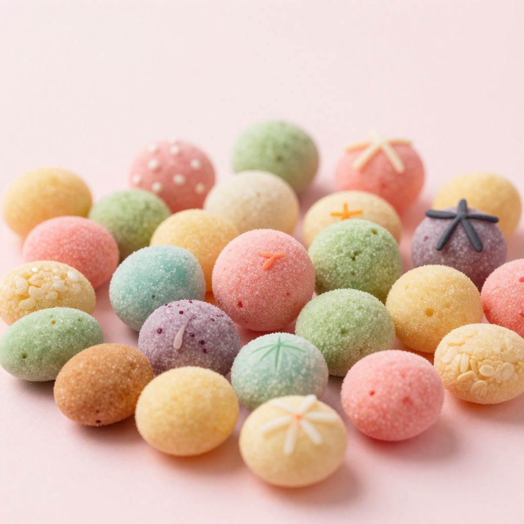 Hina-arare, colorful traditional Japanese rice crackers scattered beautifully on a festive hina matsuri display, soft pastel background, intricate details, vibrant colors, cozy atmosphere