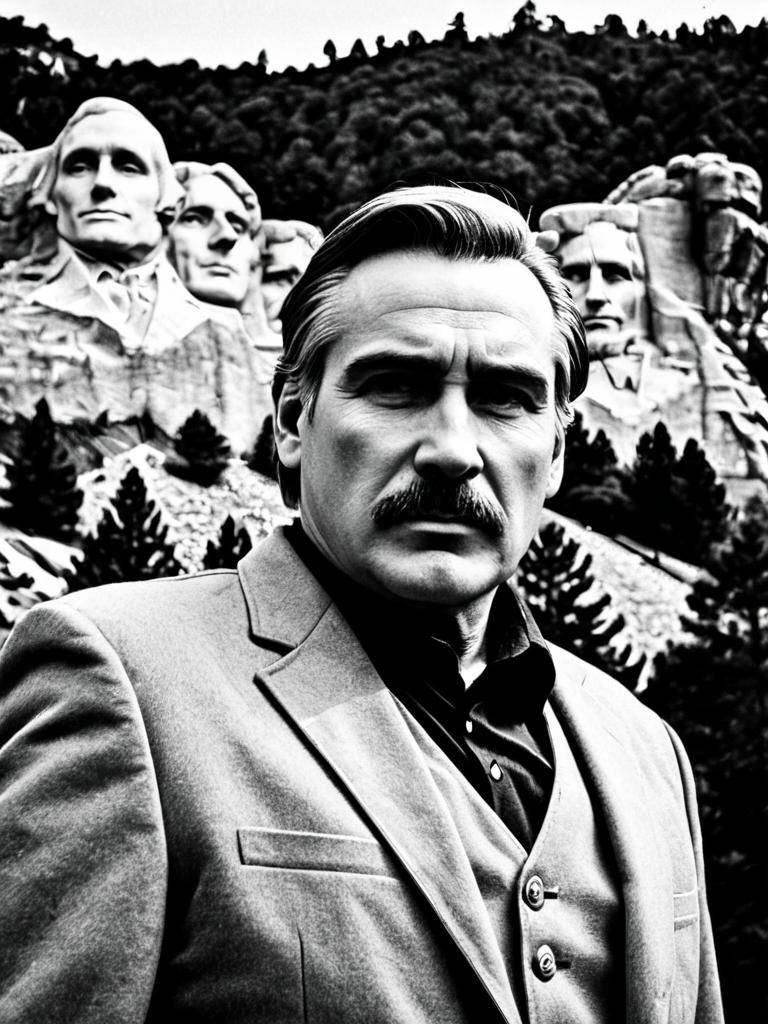 Portrait of an older man wearing a Mount Rushmore-inspired costume, including a grey hat decorated with stars, a blue shirt and tie with a star accessory, a dark vest, and a grey coat. The man stands in front of the Mount Rushmore National Memorial with the carved faces of U.S. presidents visible in the background.