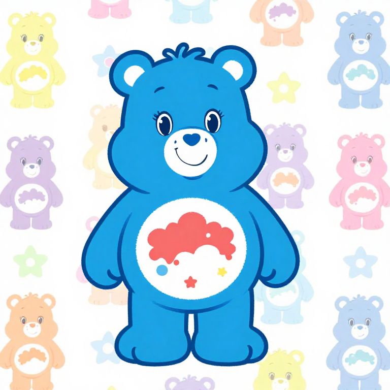 Colorful digital illustration of a cute, blue teddy bear with a white belly and red cloud emblem, surrounded by smaller pastel-colored bears.
